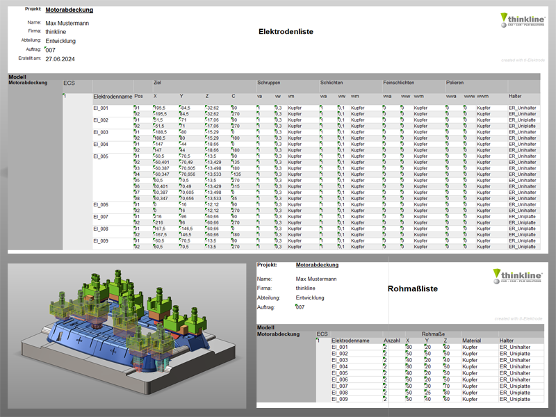 tl-Elektrode unterstützt die automatische Erstellung der fertigungsgerechten Zeichnung und Dokumentation. Vorlagen dienen zur Erstellung von Elektroden-, Positions- und Zusammenstellungszeichnungen mit Maßen und Anfahrposition. Eine nachträgliche Bearbeitung, Erzeugen von Schnittzeichnungen und weiteren Detaillierungen ist jederzeit gegeben. thinkLine Elektrode erstellt vollständige Listen im HTML-, Excel- oder Textformat. Diese enthalten sämtliche Informationen über die erstellten Elektroden mit Positionierung, Maßen, Eigenschaften und wichtigen Anmerkungen hierzu.